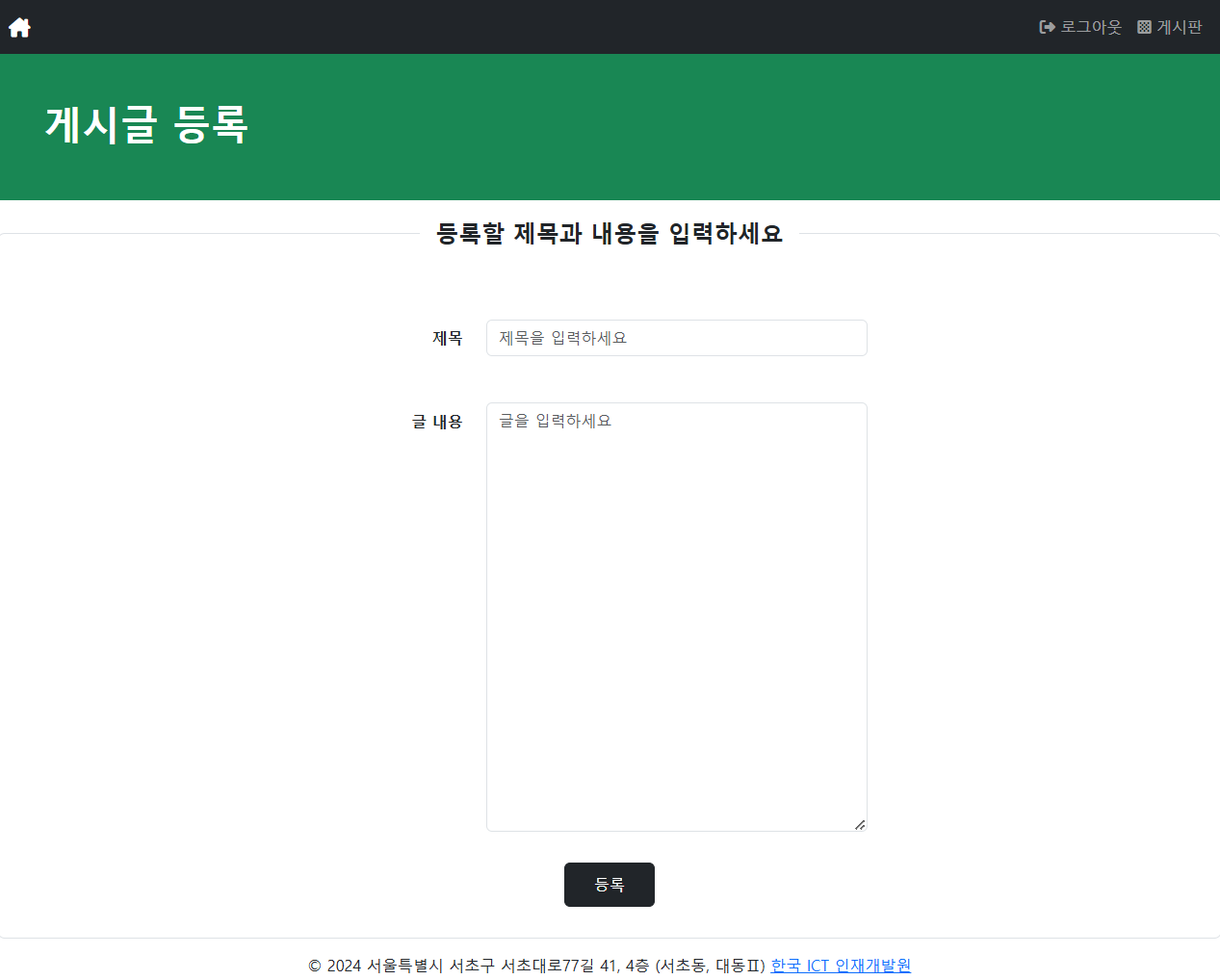 ํผ ๋ด์๋ ์ ๋ชฉ๊ณผ ๋ด์ฉ ์ ๋ ฅ ํ๋๊ฐ ์์ผ๋ฉฐ, ์ฌ์ฉ์๊ฐ ์ ๋ ฅ์ ์๋ฃํ ํ '๋ฑ๋ก' ๋ฒํผ์ ํด๋ฆญํ๋ฉด ๋ฐ์ดํฐ๊ฐ ์๋ฒ๋ก ์ ๋ฌ๋์ด ๊ฒ์๊ธ์ด ์์ฑ๋ฉ๋๋ค.